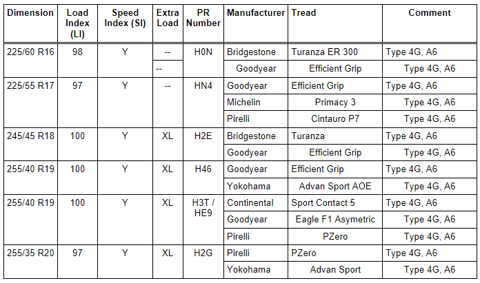Tire Pressures A6, (C7), Type 4G Sedan and Avant