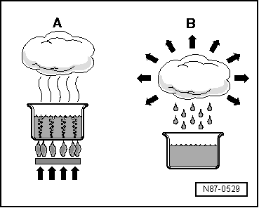 When water is heated in a container (heat absorption), water vapor can be seen to rise. If the vapor is further heated through heat absorption, the visible vapor turns into invisible gas. The process is reversible. If heat is extracted from water in gaseous form -A-, it changes first to vapor -B-, then to water and finally to ice.