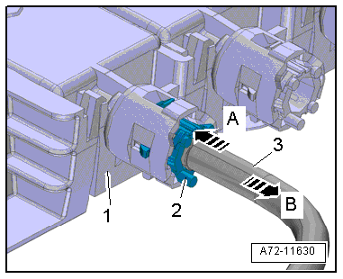 - Press the release ring -2- towards the valve block -1--arrow A- and simultaneously pull on the pneumatic line -arrow B- to release and remove the pneumatic line -3-.