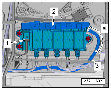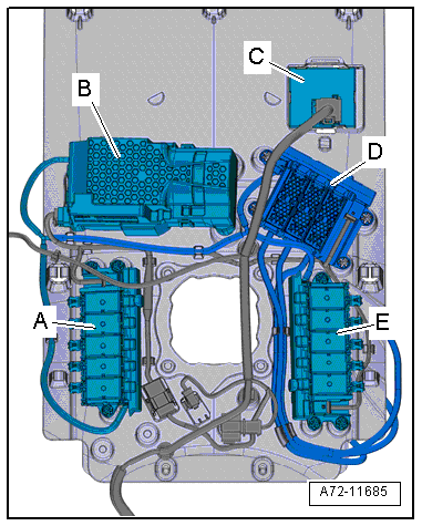 - Remove the valve block -A and E- for the massage mat. Refer to → Chapter "Massage Mat Valve Block, Removing and Installing".