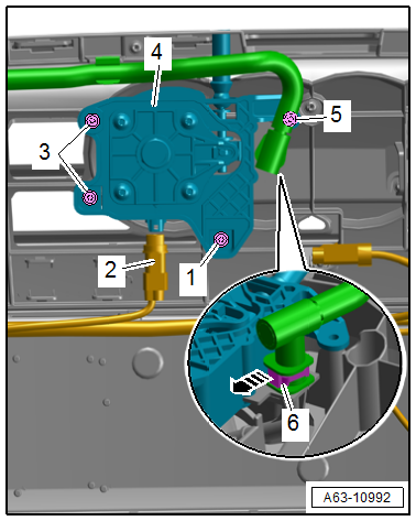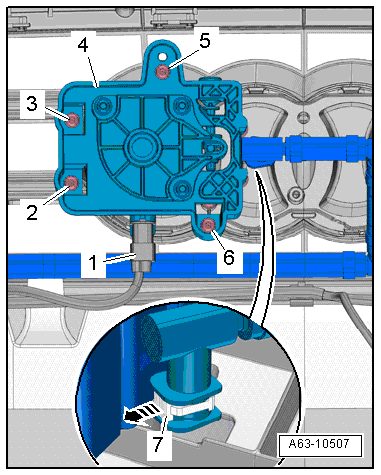 - Open the clamp -6--arrow- and remove the washer fluid hose.