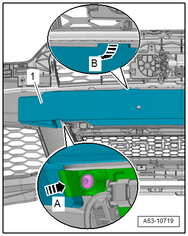 - Pull air intake grille -1- off of the bumper cover -arrow- and remove it.