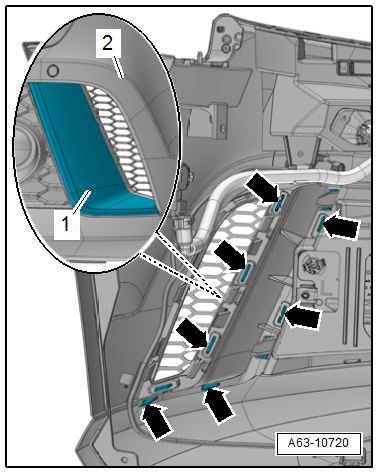 - Release the retainer -arrow A- and disengage the molded foam part -1- by moving the top of the molded foam part in the direction of -arrow B-.