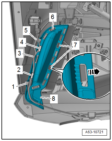 - Press off the cover -8- from the bumper cover, to do this push the catches -2, 4, 6, and 7- slightly to the side -arrow-.