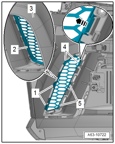 - Release the catches -1, 4, and 5--arrow- and the air intake grille -3- from the bumper cover -2-.