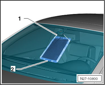 The Solar Battery Maintainer -VAS6102A- is secured on the interior rearview mirror -1-. The bottom rests on the instrument panel -2-.