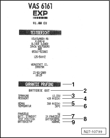- Press theStart-button. Refer to → Chapter "Battery Tester with Printer -VAS5097A- Device Description".