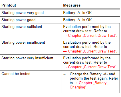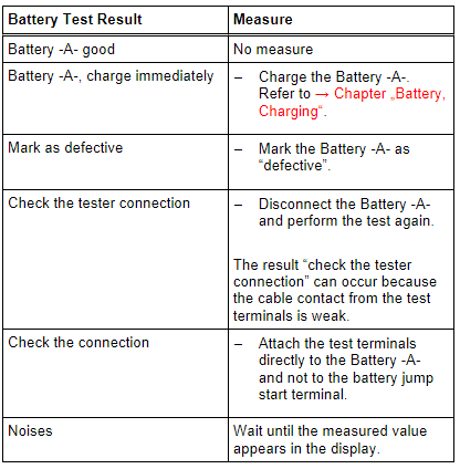 Depending on the test results Battery Tester with Printer -VAS5097A- (refer to → Chapter "Test Result Evaluation"), additional test steps or work for a clear evaluation of the battery charge must be made.
