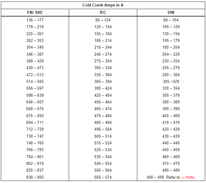 If the Battery -A- does not state this value in DIN but rather in IEC or EN/SAE, then convert the value using the table (refer to → Chapter "Cold Crank Amps Table") or the table on the Battery Tester with Printer -VAS5097A-.