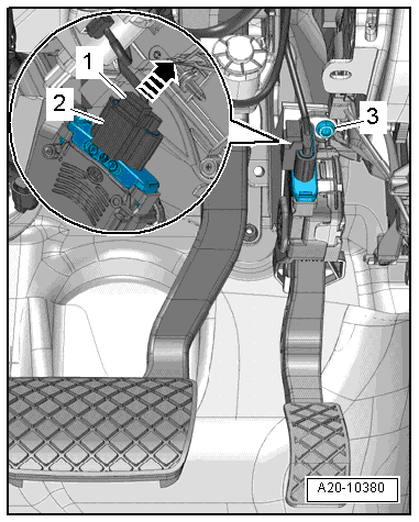- Install the accelerator pedal module. Refer to → Fuel Supply System; Rep. Gr.20; Accelerator Mechanism; Accelerator Pedal Module with Accelerator Pedal Position Sensor G79/G185, Removing and Installing