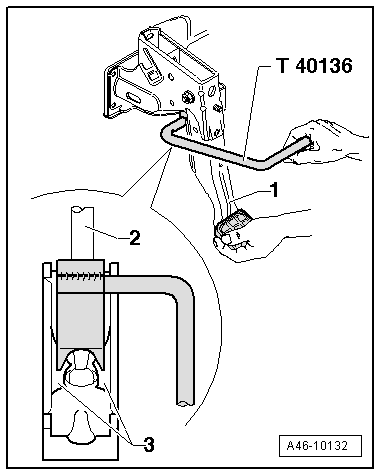 - Insert the Brake Servo Release Tool -T40136- and pull in the direction of the driver seat while counter-holding at the brake pedal -1- so that it does not move backward. While doing so, the mount retaining tabs -3- will be pushed out of the pushrod ball head -2-.