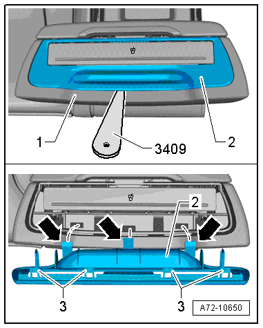 - Release the tabs for the center armrest trim -2- using the Trim Removal Wedge -3409- on the lower side of the center armrest cover -1-.