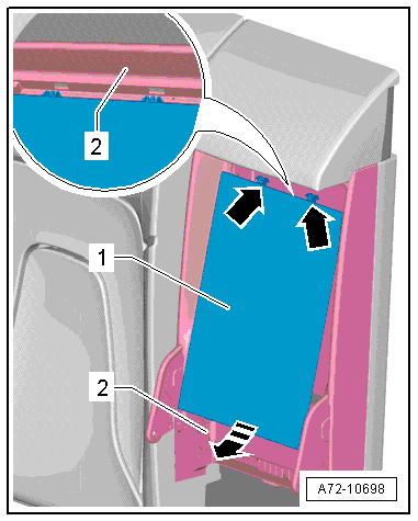 - Remove the rear center armrest storage tray. Refer to → Chapter "Center Armrest Center Storage Compartment, Removing and Installing, Market-Specific".