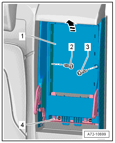 - Fold the center armrest -1-2/3 up and remove the screws -4-.
