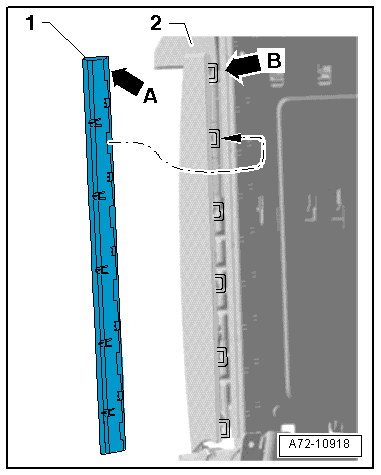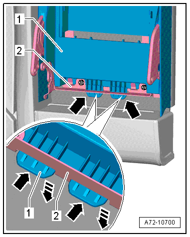 - Press the tabs -arrows- in direction of -arrow- until they come out of the trim -1- on the bracket -2-.
