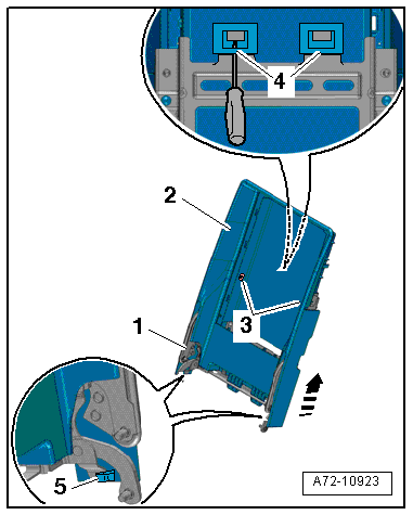 - Lift the guides -4- using a screwdriver and at the same time, remove the center armrest cover -2- in direction of -arrow- upward from the bracket -1-.