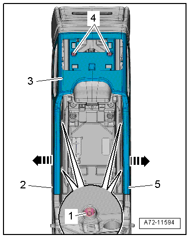 - Remove the upper trim -3- from the center armrest -arrows- and release the left and right retaining hooks -1-.