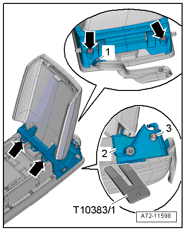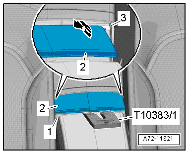 - Using the Wedge Set -T10383/1-, release the trim on the side -2- and press the spring bolts -3- together to remove the armrest from the lower section of the armrest.