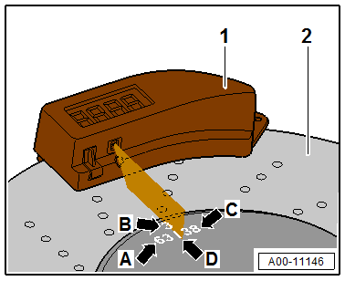 - Move the Carbon-Ceramic Brake Wear Tester -VAS6813--1- along the outer edge -2- until the laser beam points exactly on the mark -D- on the brake rotor.