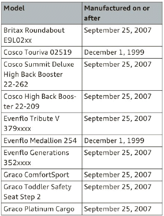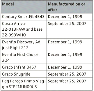 For this reason, the United States National Highway Traffic Safety Administration has published a list of specific type, makes and models of child restraints that must be used to certify compliance of the Advanced Airbag System in your vehicle with the suppression requirements of Federal Motor Vehicle Safety Standard 208. These child restraints are: