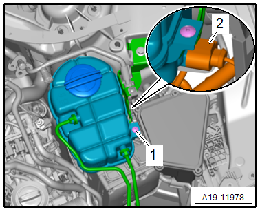 - Disconnect the connector -2- and move the coolant expansion tank with the coolant hoses still connected to the side.