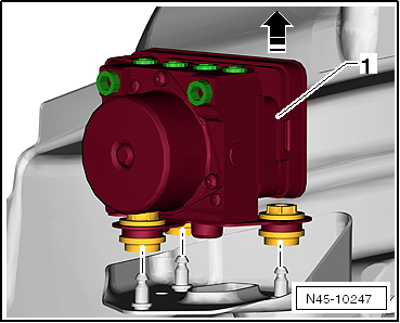 - Remove the ABS Hydraulic Unit -N55--1- with ABS Control Module -J104- and bracket upward in the direction of the -arrow- and remove it from the engine compartment.