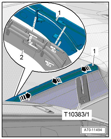 - Vehicles with sun shade: starting at the top, use the Wedge Set -T10383/1- to unclip the trim panel -1- for the sun shade guide strip -arrows-.