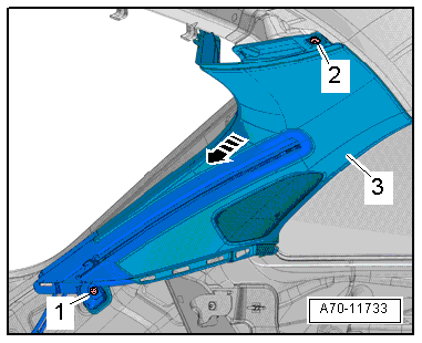 - Pull the lower part of the trim upward and out of the sun shade guide strip -2-; then remove it from the inside.