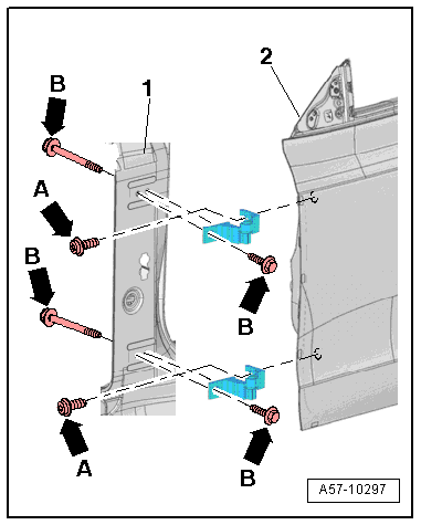 - Loosen the bolts -B arrows- on the top and bottom of the hinge and on the A-pillar -item 1-.