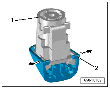 - Spread the clips -arrows- and remove the cover cap -2- from the housing -1- using an awl if necessary.