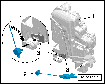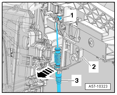 - Disengage the operating cable -1- on the operating lever by pressing the cable bracket -3- out of the mount on the mounting bracket -2--arrow-.