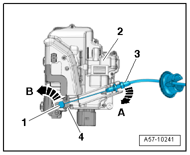 - Turn the nipple -1- 90º in the direction of -arrow B- and remove it from the door opener release lever -4-.
