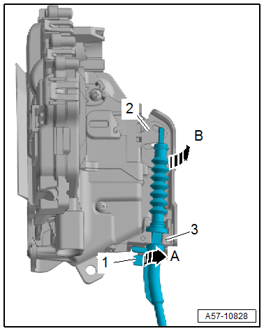- Rotate the cable on the door lock release lever -3- in the direction of -arrow B-.