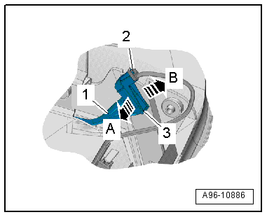- Remove the bulb -3- from the center console in direction of -arrow A- and from the lighting strip -1- at the same time in direction of -arrow B-.