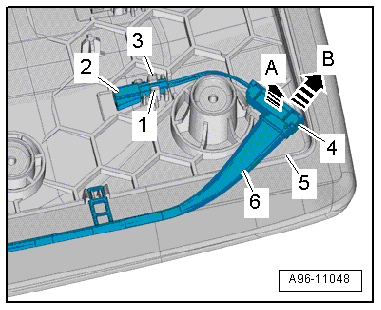- Remove the bulb -4- from the center armrest padding -5- in direction of -arrow A- and, at the same time, release it from the lighting strip -6- in the direction of -arrow B-.