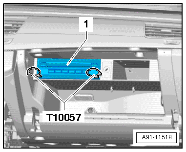 - Insert the two clips on the Radio Removal Tool -T10057- in the release slits on the CD Changer -R41--1- until they engage. Points on the grip eyelets of tool face outward.