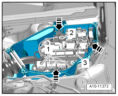- Open the retainers in direction of -arrow- and remove the relay carrier with the fuse panel -3- and set aside.