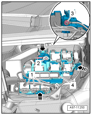 - Open the retainers -arrow- and remove the relay carrier with the fuse panel -4- and set aside.