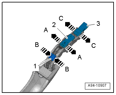 If it is not possible to remove the bulb for the exterior door handle illumination bulb on a vehicle with keyless entry because the electric wires are twisted, then release the tabs in direction of -arrows C- and remove the connector -3-.