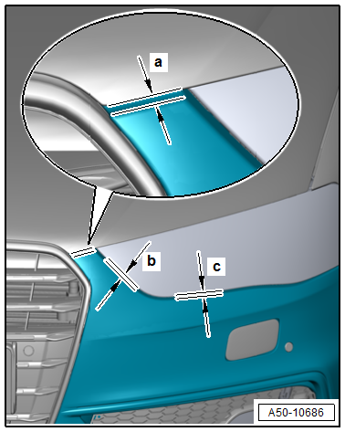 - Check the gap dimension. Refer to → Chapter "Front Bumper Cover Gap Dimensions", and repeat the adjustment if necessary.