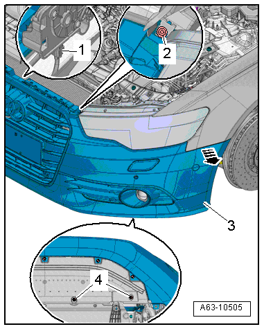- Disengage the side bolster -3- from the front side panel -arrow- and remove the bumper cover with a second technician.