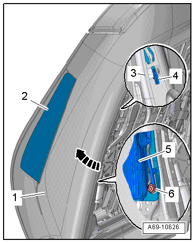 - Remove the seat cover around the side airbag on the backrest until the bolt -6- for the side airbag is accessible. Refer to → Chapter "Backrest Cover and Padding, Removing and Installing, Standard/Sport Seat".