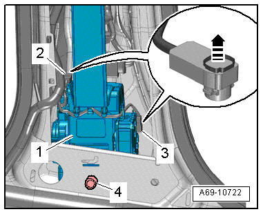 - Pull the connector lock -4- out and push it down, then disconnect the connector -3- from the seat belt igniter and seat belt force limiter.