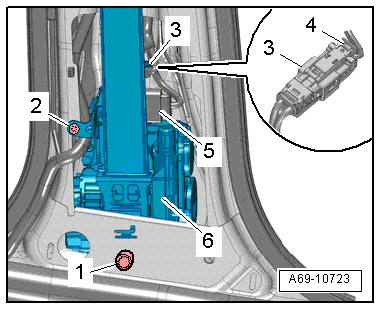 - Remove the bolts -1 and 2- and then remove the automatic belt retractor -6- from the mount.