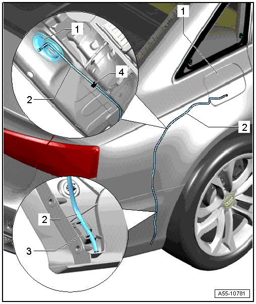 - Pull the drain hose out of the guide on the bumper. Refer to → Chapter "Overview - Fuel Filler Door Unit Drain Hose".