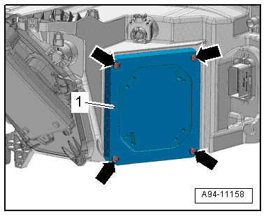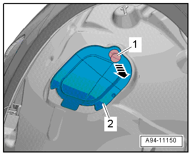 - Turn the housing cover -1- counter-clockwise -arrow- and remove it from the headlamp housing.