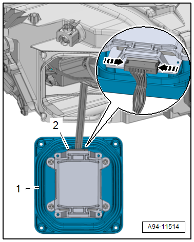 - Disconnect the connector -2- on the power output stage by pressing the release buttons in direction of -arrows- using the Spark Plug Pliers -VAG1922-.