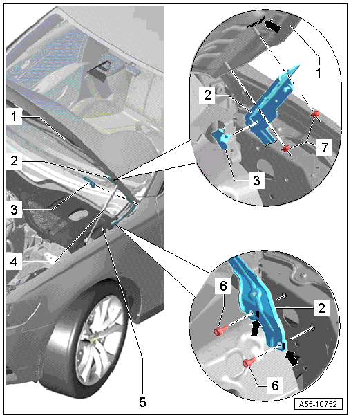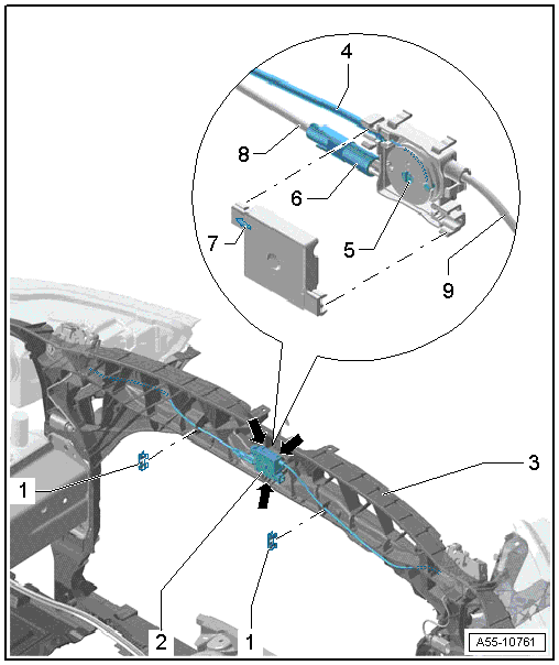 - Remove clips -1- and lift the release cables -8- and -9- on both sides toward the hood latches.