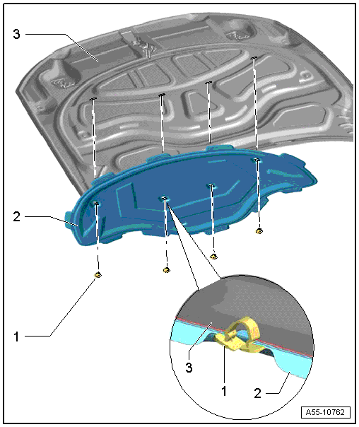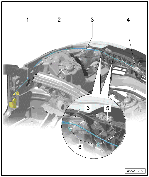 - Route the release cable -3-, starting from the passenger compartment, inside the engine compartment and along the fender flange -2- as illustrated.