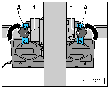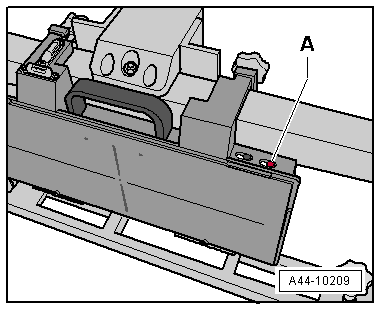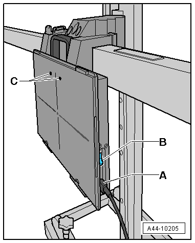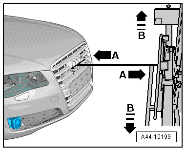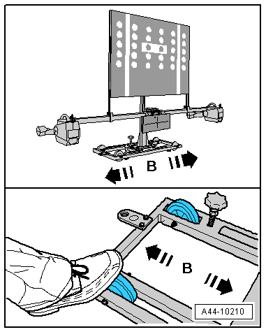 - Move the Setting Device Basic Set -VAS6430/1- sideways -arrow B- until the display on the alignment computer is within the tolerance range.